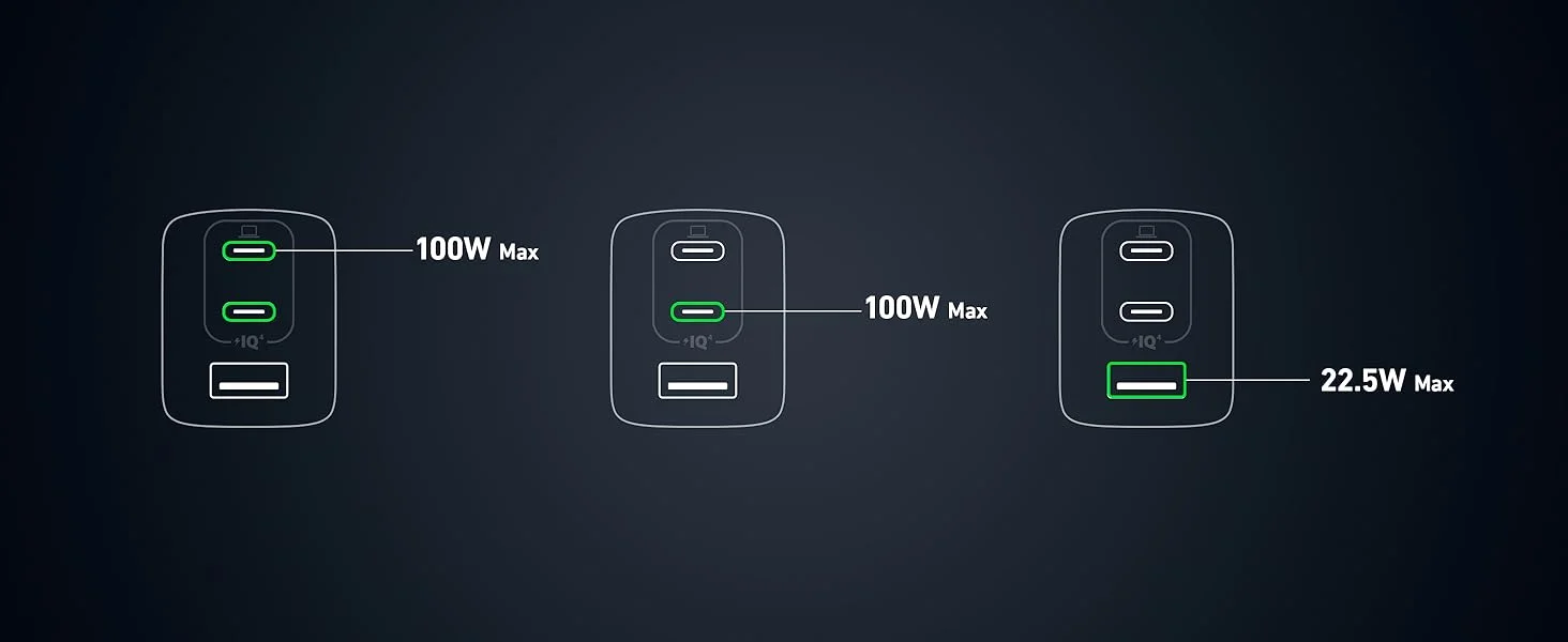 Carga 3 Dispositivos Simultáneamente Optimiza tu espacio y tus tomas de corriente. Con dos puertos USB-C y un puerto USB-A, puedes cargar simultáneamente tu computadora portátil, tablet y smartphone. Al usar un solo puerto USB-C, el cargador entrega hasta 100W, lo que permite cargar una MacBook Pro de 16" al 50% en solo 30 minutos. Es el accesorio indispensable para profesionales móviles y viajeros que necesitan mantener todos sus equipos operativos.