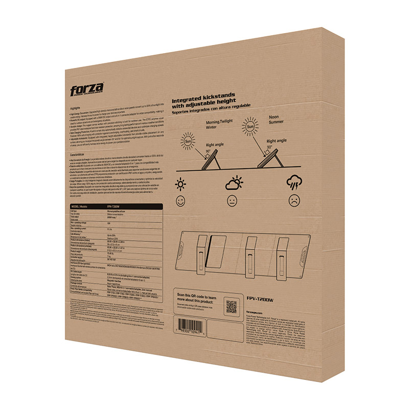 Maximiza tu independencia energética con el Forza FPV-T200W, el panel solar de alto rendimiento que entrega hasta 200W de potencia pura. Equipado con células monocristalinas de última generación, este modelo alcanza una eficiencia del 23%, permitiendo una carga rápida de tus estaciones de energía incluso en días nublados. Su diseño robusto y plegable cuenta con certificación IP67, lo que garantiza una resistencia total al agua y al polvo. Gracias a su conectividad universal 6-en-1, es el complemento perfecto para aventureros y profesionales que requieren un respaldo de energía inagotable en cualquier lugar del mundo.