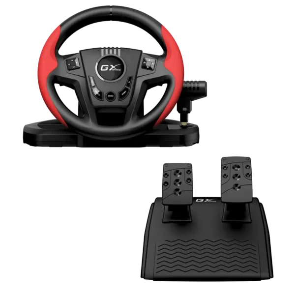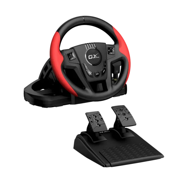 Volante de carreras Genius SpeedMaster, compatible con PC (D‑Input/X‑Input), PS3 y PS4. Gira 270°, cuenta con doble motor de vibración para realismo, pedales de acelerador/freno con palanca de cambios integrada y clavijas USB directas para una instalación rápida y sencilla.