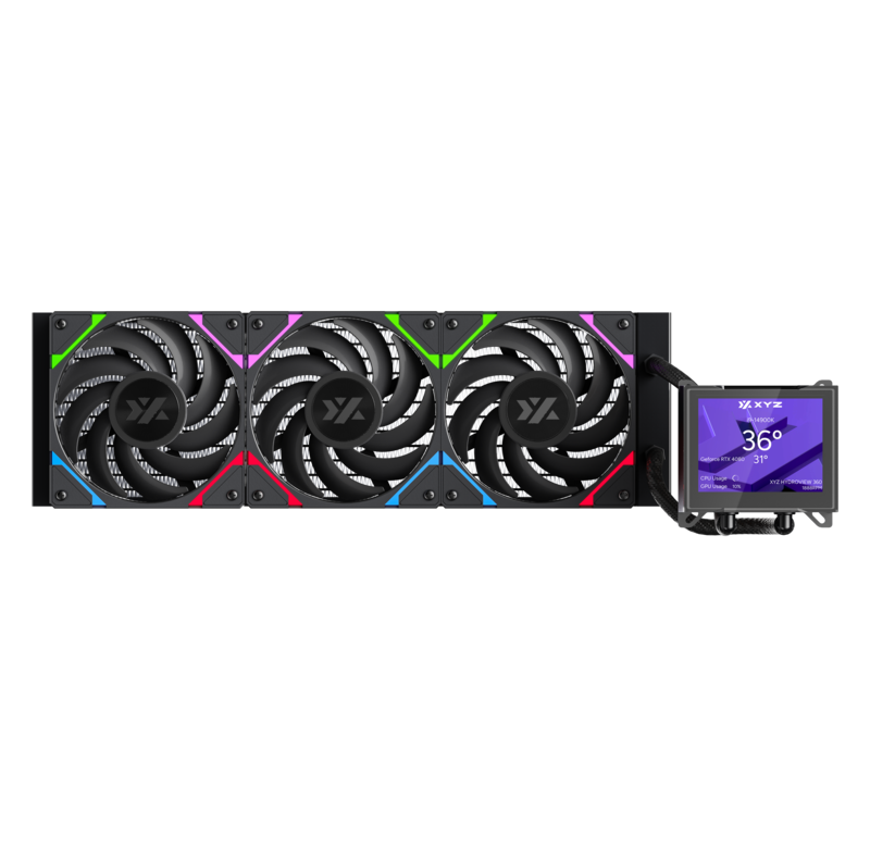 El XYZ HYDROVIEW AIO 360 es el futuro de la refrigeración líquida personalizada. Este avanzado sistema todo en uno de 360mm incorpora una pantalla digital LCD de 3.5 pulgadas en el bloque de la bomba, permitiendo monitorear temperaturas de CPU/GPU en tiempo real o reproducir imágenes y videos personalizados. Impulsado por tres potentes ventiladores Vortex PRO ARGB de 120mm, garantiza un flujo de aire masivo y un funcionamiento ultra silencioso, manteniendo los procesadores más exigentes operando siempre a su máxima capacidad térmica.